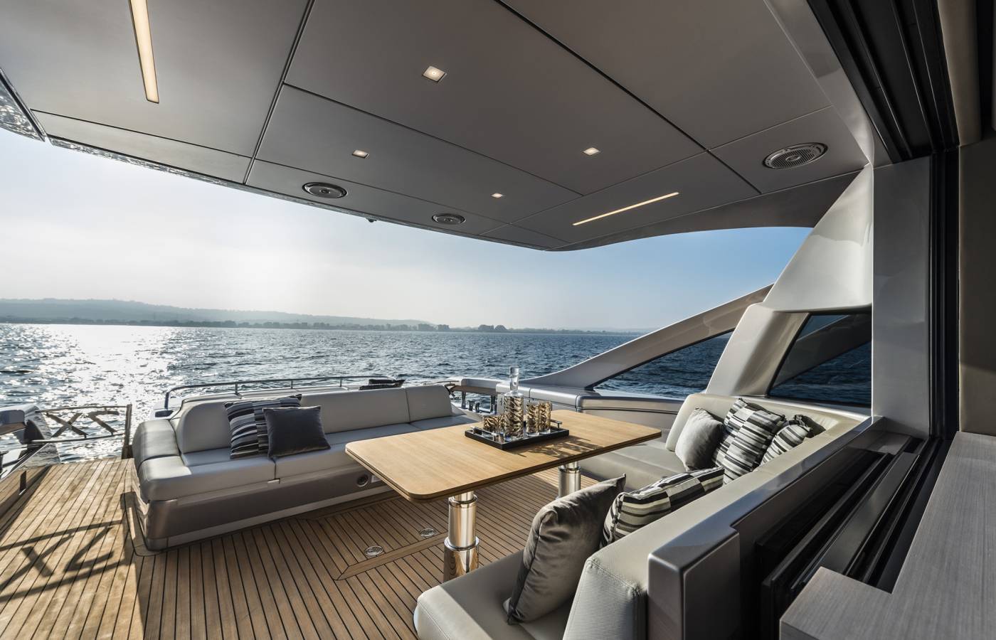 Beach-club mindset: wide swim platform, tender/toy access, and modular lounge seating that pivots from day cruising to sunsets.
