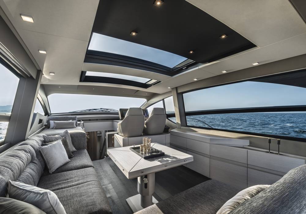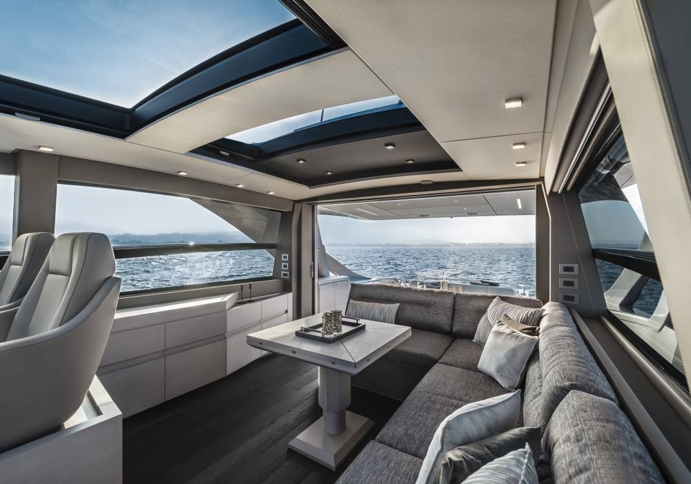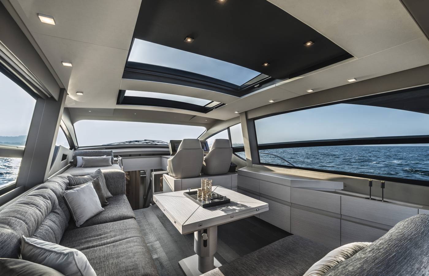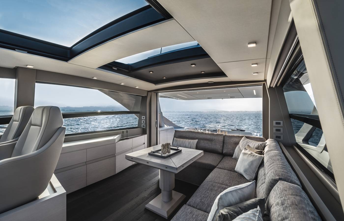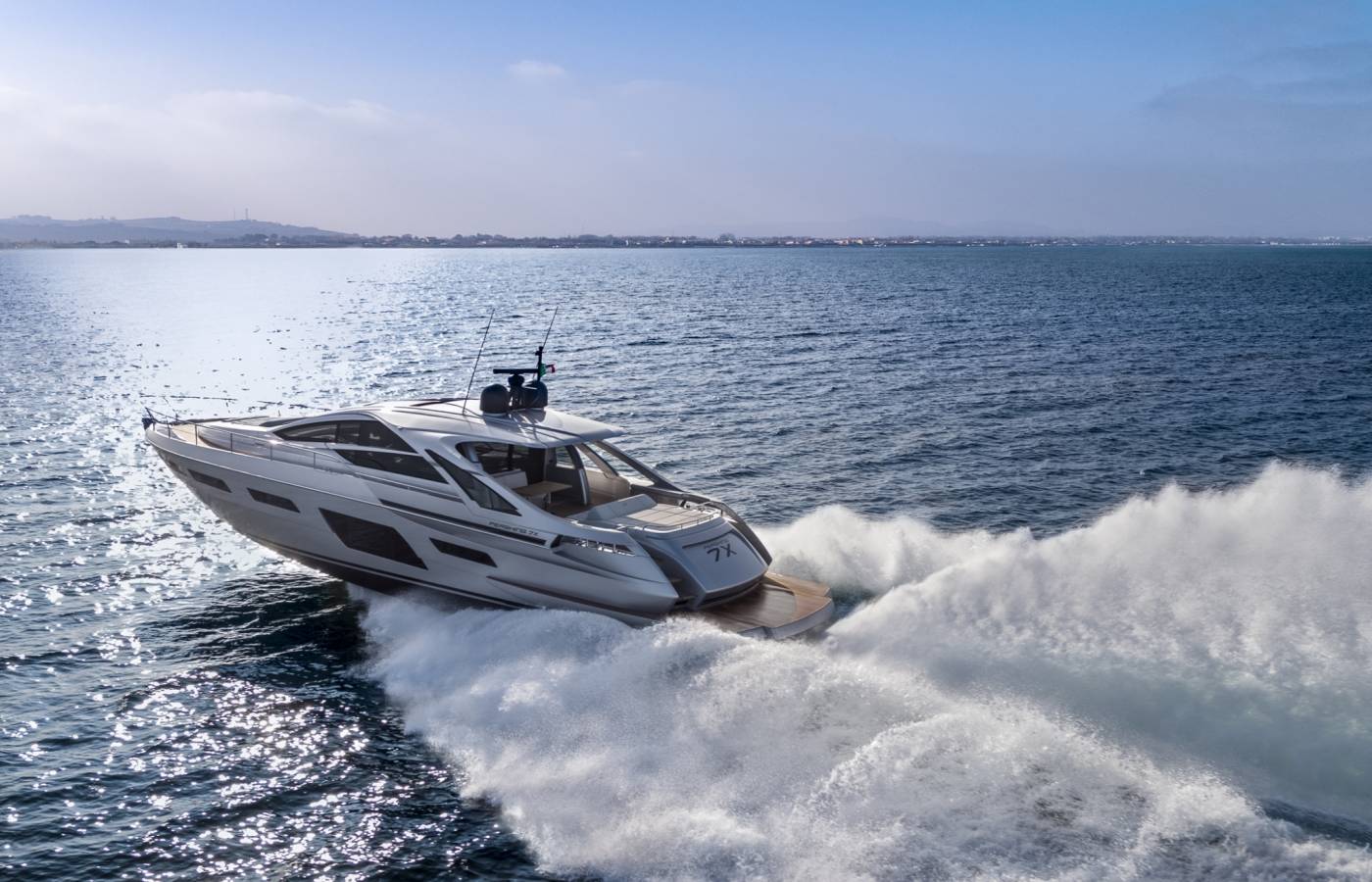 Speed becomes calm aboard the 7X. Panoramic glazing floods salon and cabins with light, while low-slung furnishings, leather accents, and warm woods set a crisp, contemporary mood. A wide glass door unites salon and cockpit for true indoor–outdoor flow. The full-beam master adds a spa-style ensuite; guest cabins feel like boutique suites. From sunrise swims to golden-hour aperitivi, every transition is effortless—performance outside, sanctuary within.