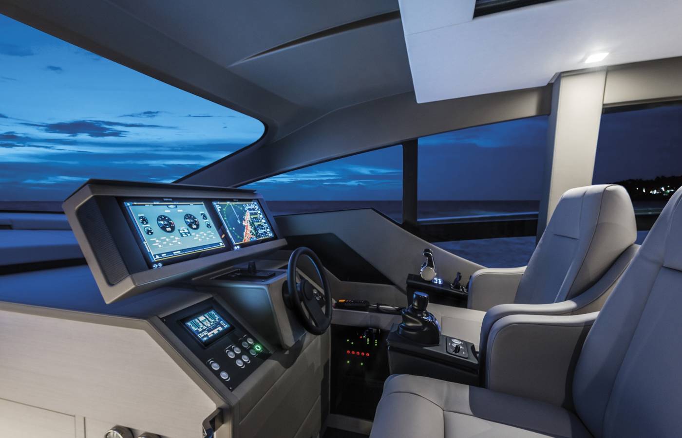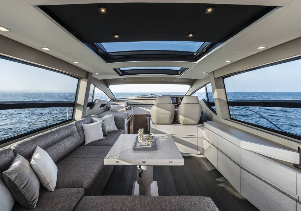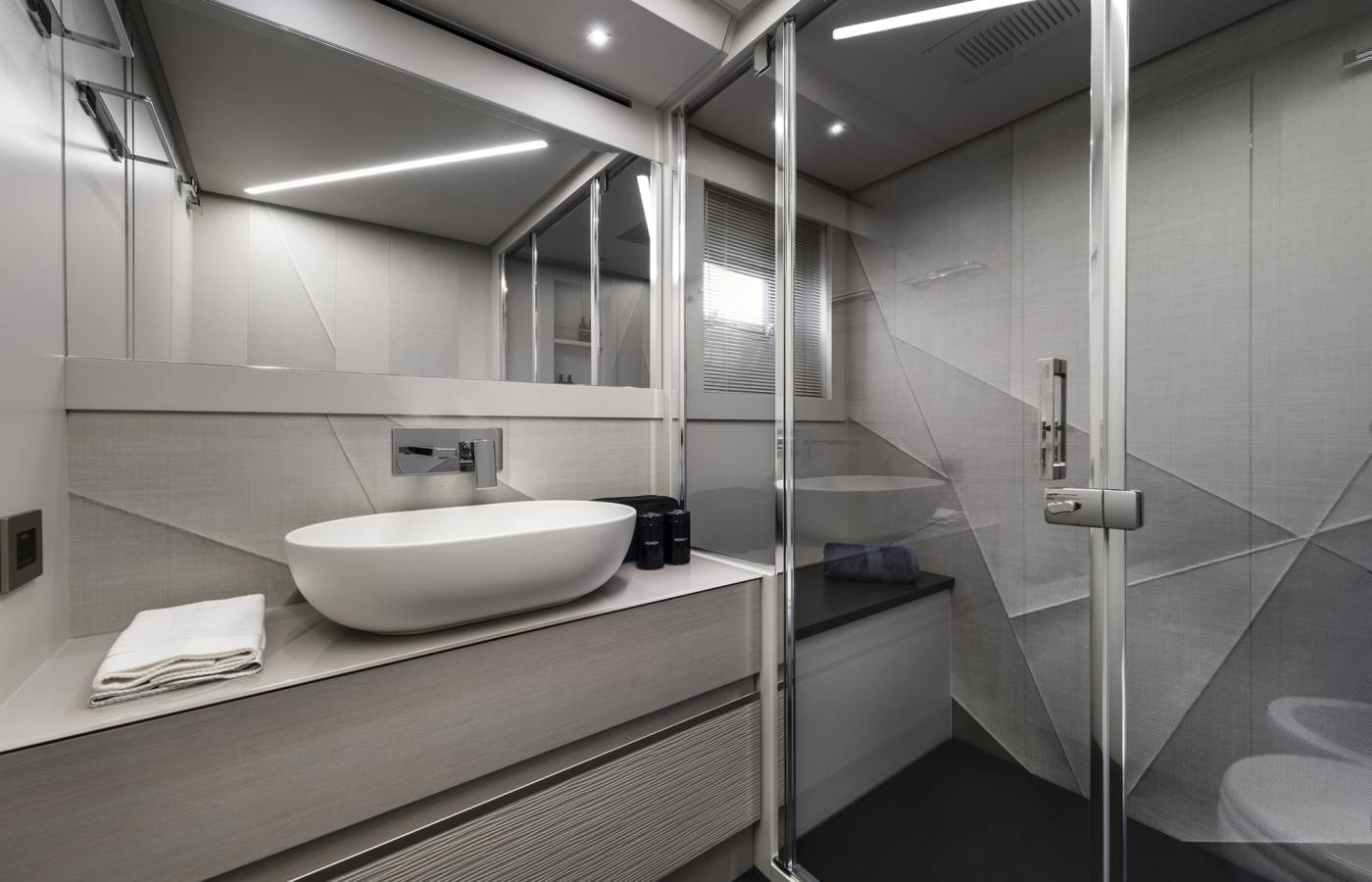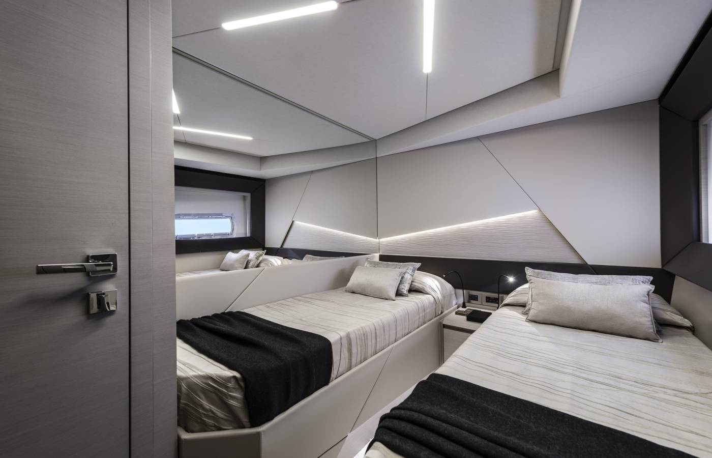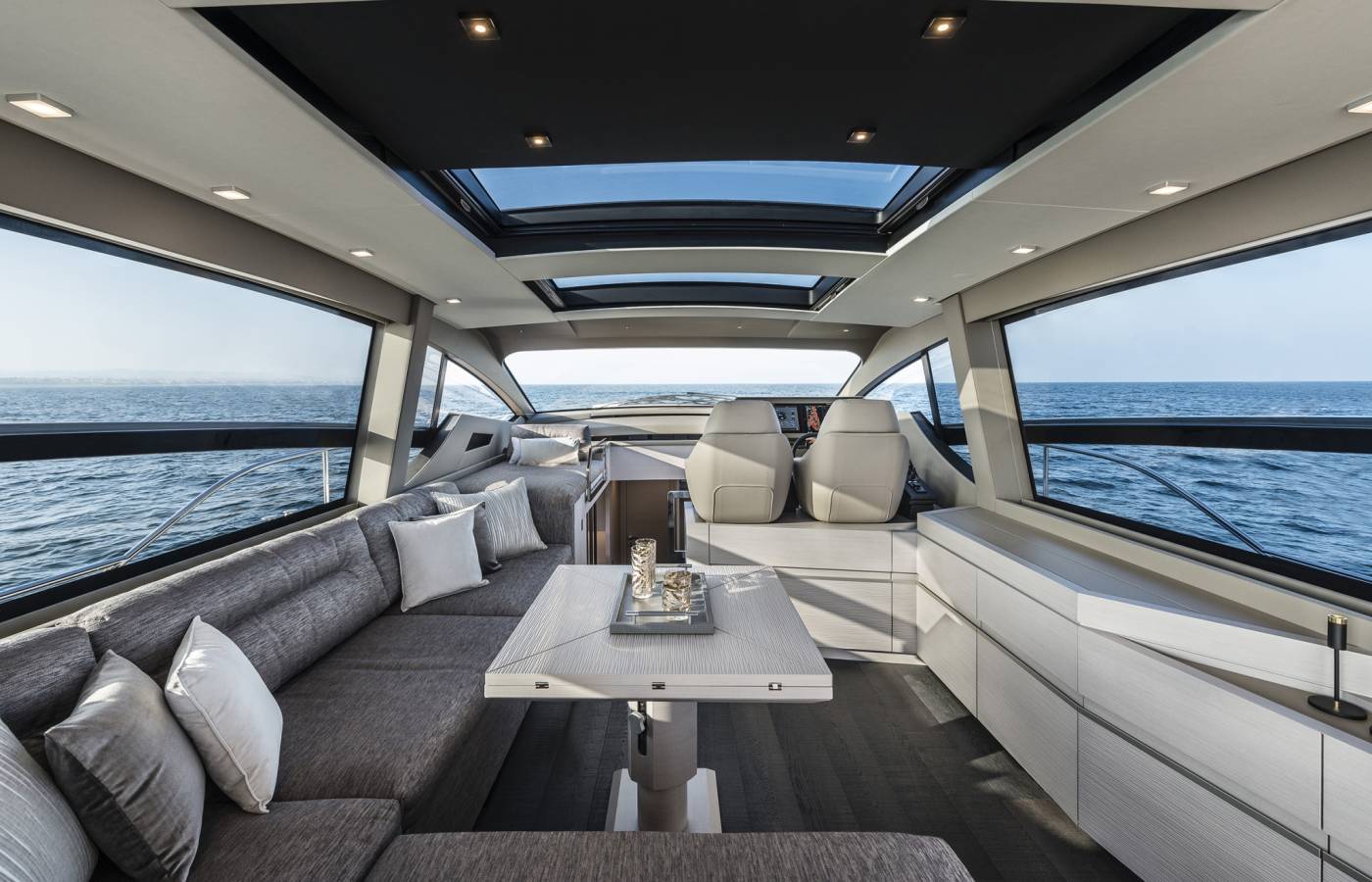 Speed becomes calm aboard the 7X. Panoramic glazing floods salon and cabins with light, while low-slung furnishings, leather accents, and warm woods set a crisp, contemporary mood. A wide glass door unites salon and cockpit for true indoor–outdoor flow. The full-beam master adds a spa-style ensuite; guest cabins feel like boutique suites. From sunrise swims to golden-hour aperitivi, every transition is effortless—performance outside, sanctuary within.