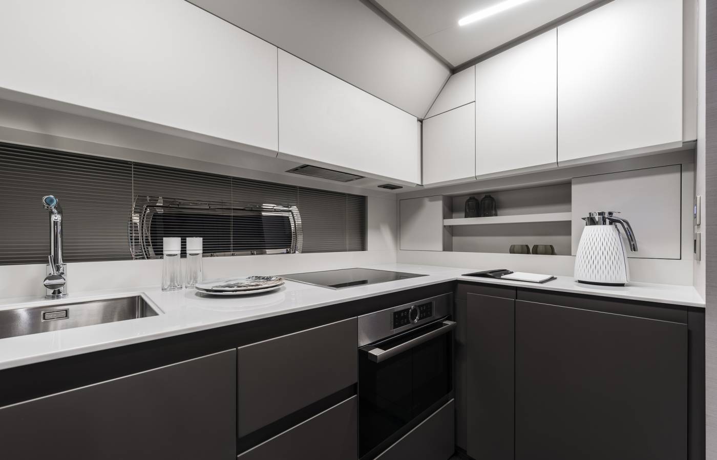Aft-galley ease with premium appliances, generous prep space, and a pass-through to the cockpit—made for hosting inside or out.