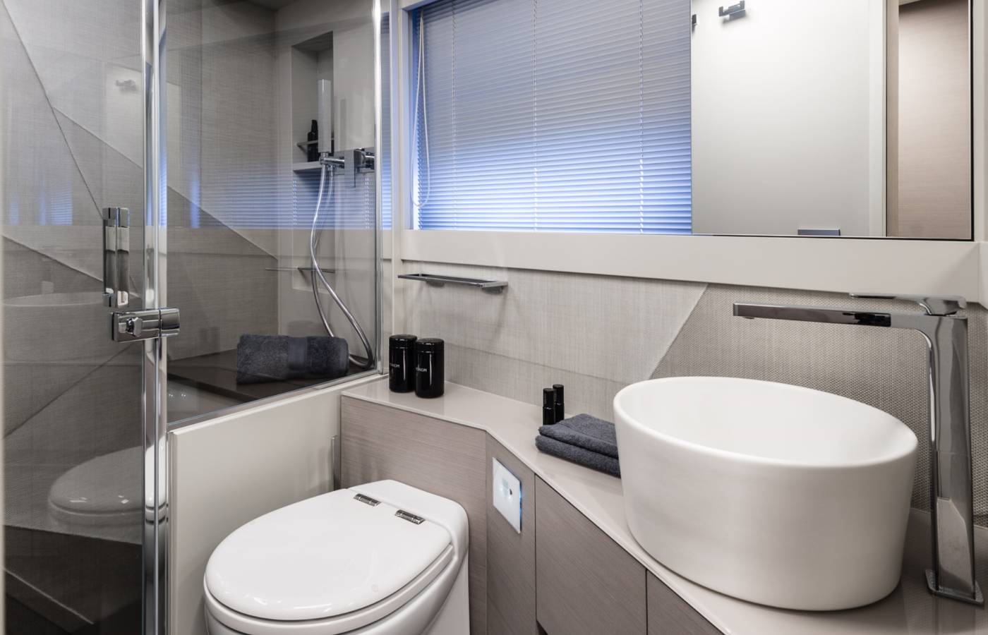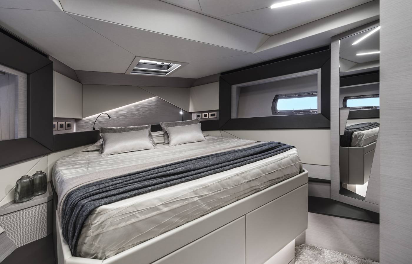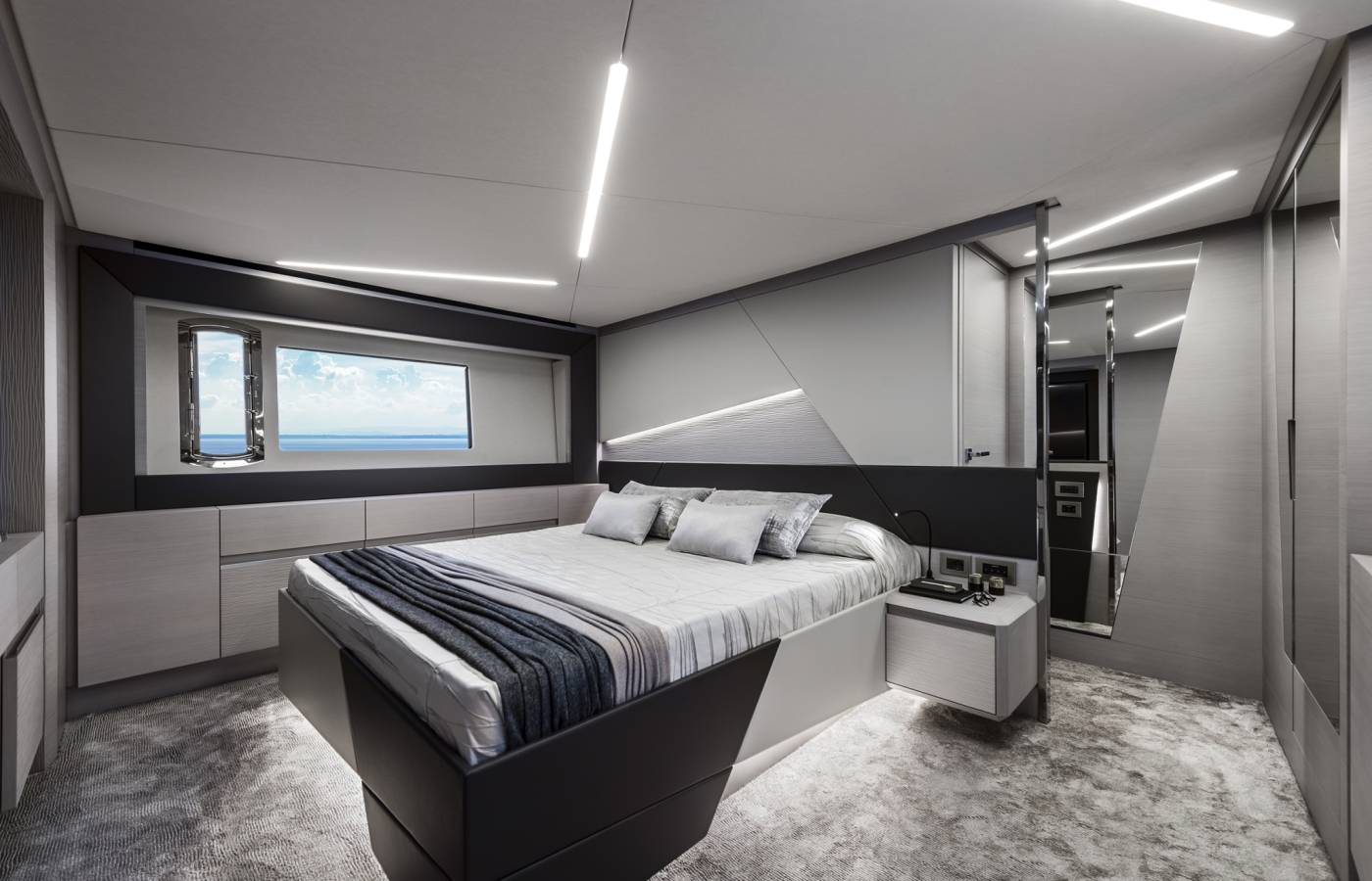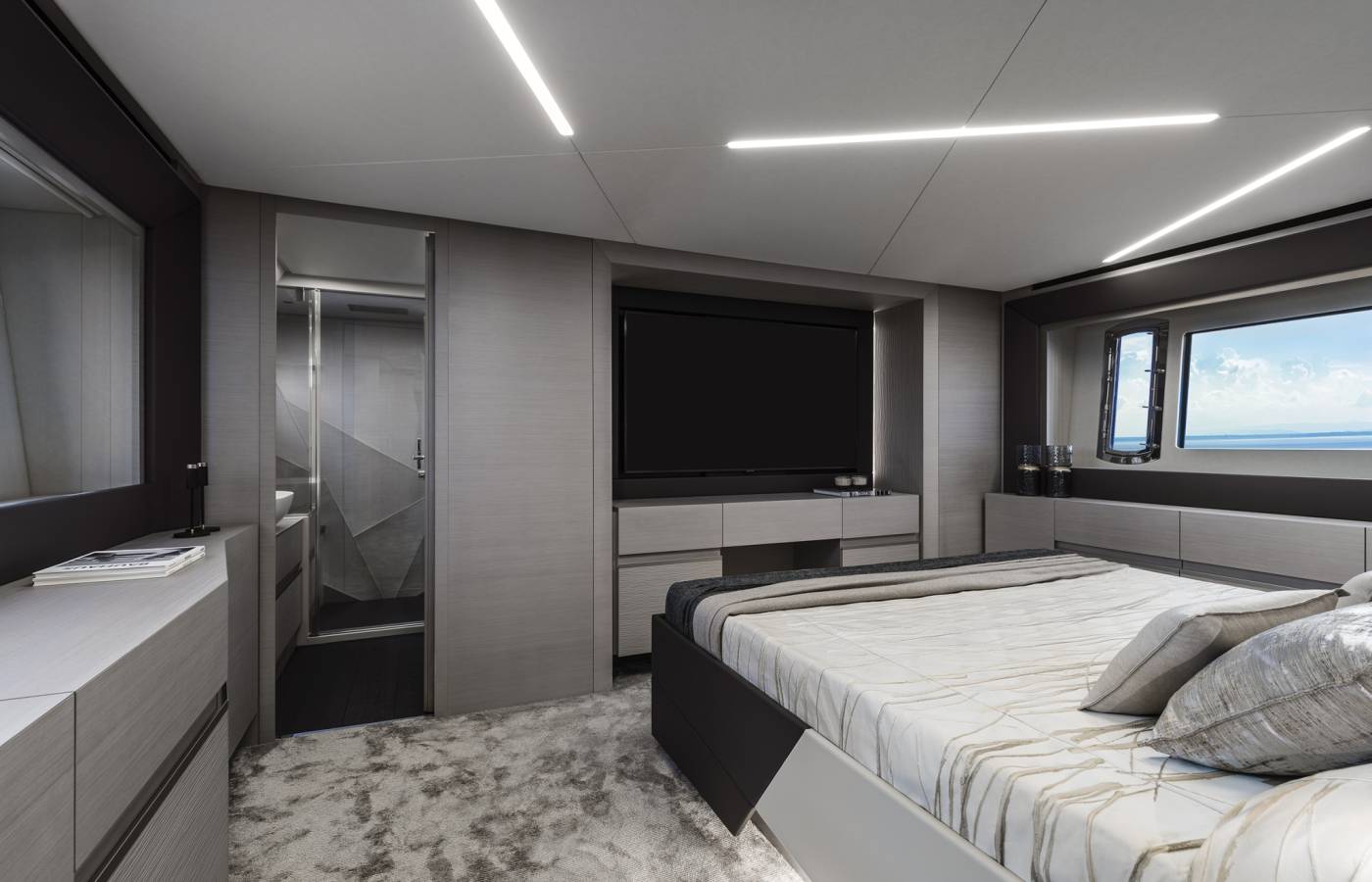 The master cabin delivers full-beam calm with expansive glazing that pours in natural light, refined textures, and a spa-style ensuite—quiet, residential, unmistakably Pershing.
