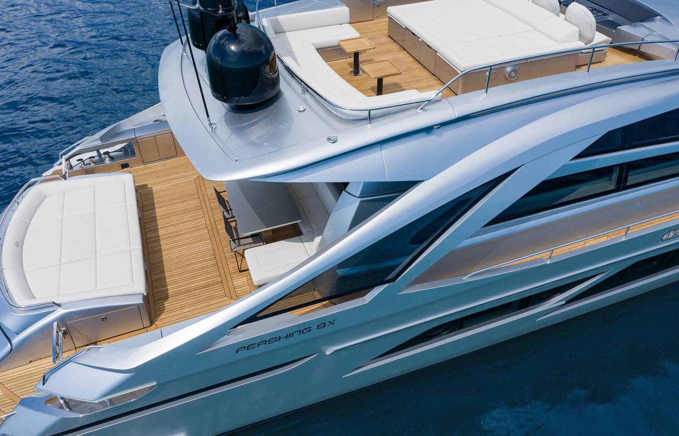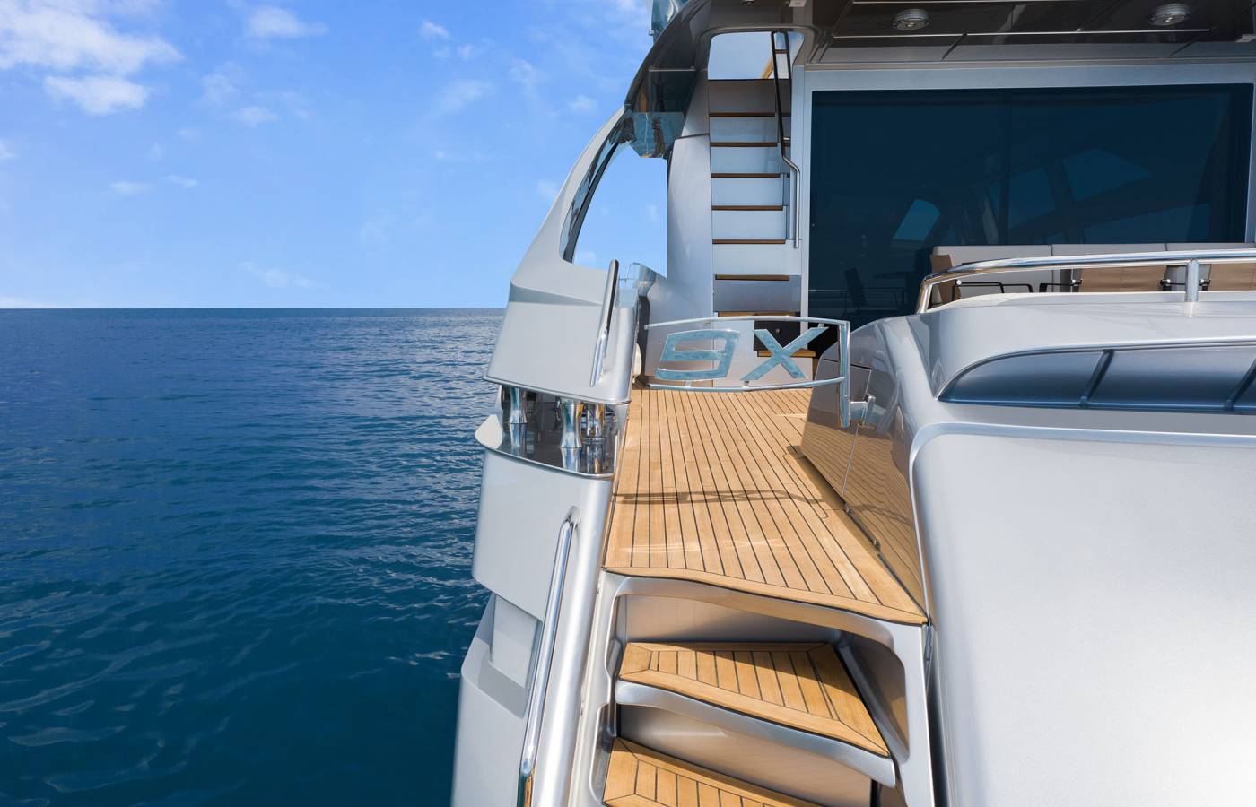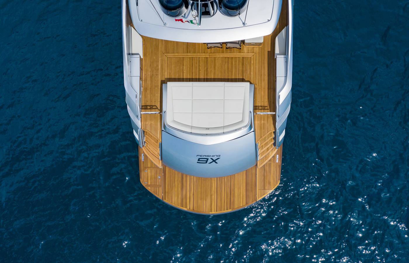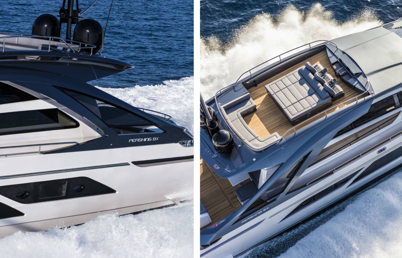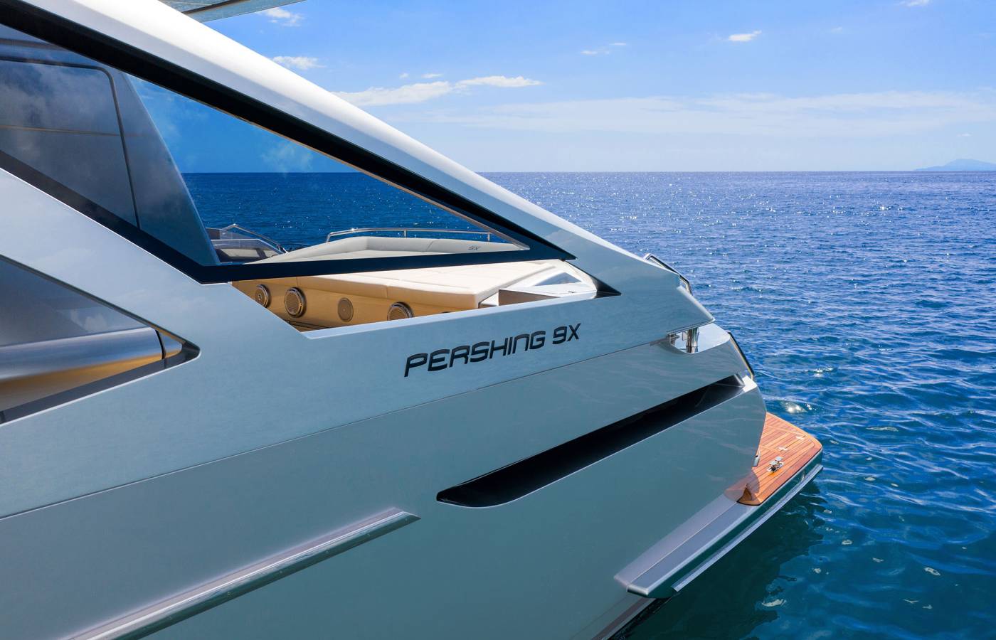 The Pershing 9X is innovative in every way, beginning from the composite materials, based on carbon, vinyl ester resin and epoxy resin. Its sporty lines are exalted by the large side wings and the aerodynamic profile of the sun deck. The open-air foredeck area and the sundeck combine supreme comfort with maximum privacy, while the interior décor stands out for elegance and sophistication.