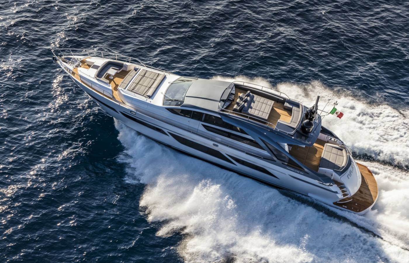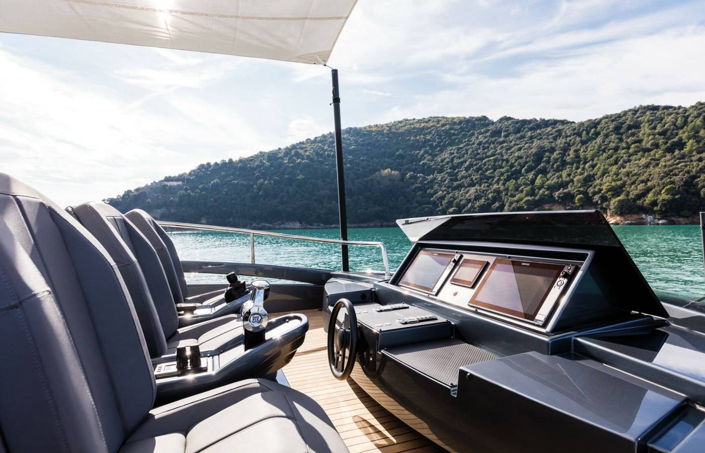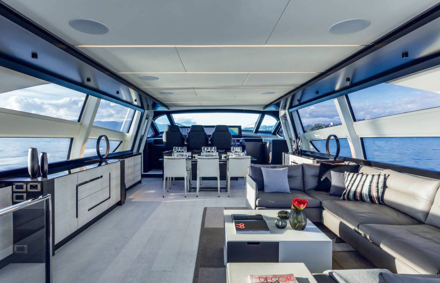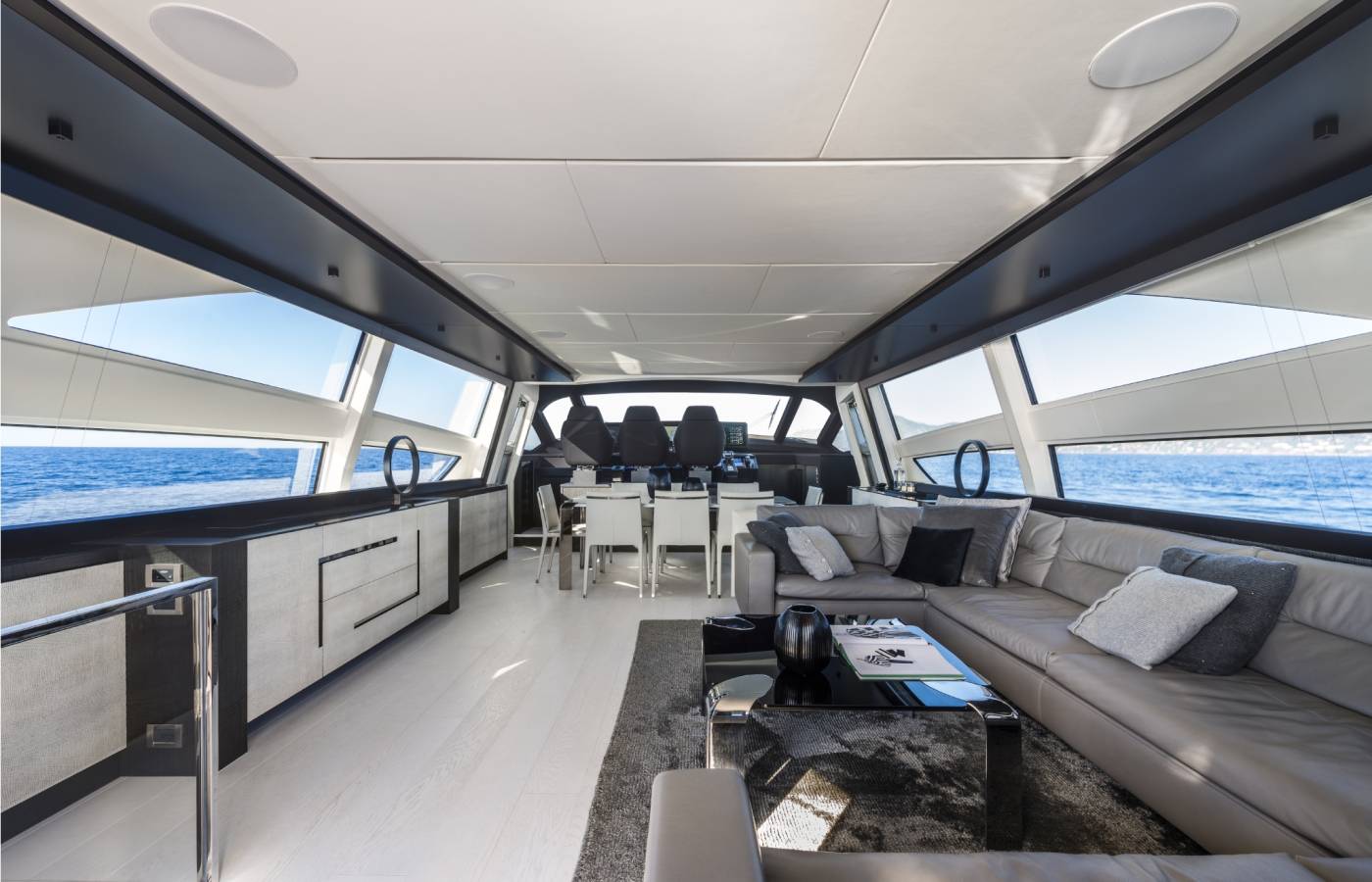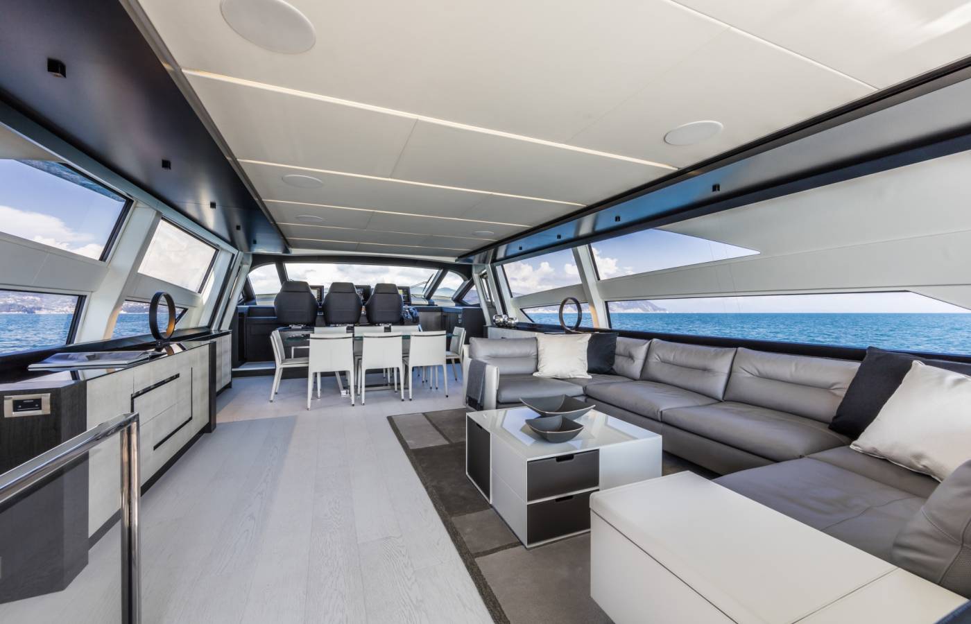 The interior décor boasts the best Italian brands, such as the leather-upholstered “Interior in Motion” helm station which celebrates the partnership between Pershing and Poltrona Frau.