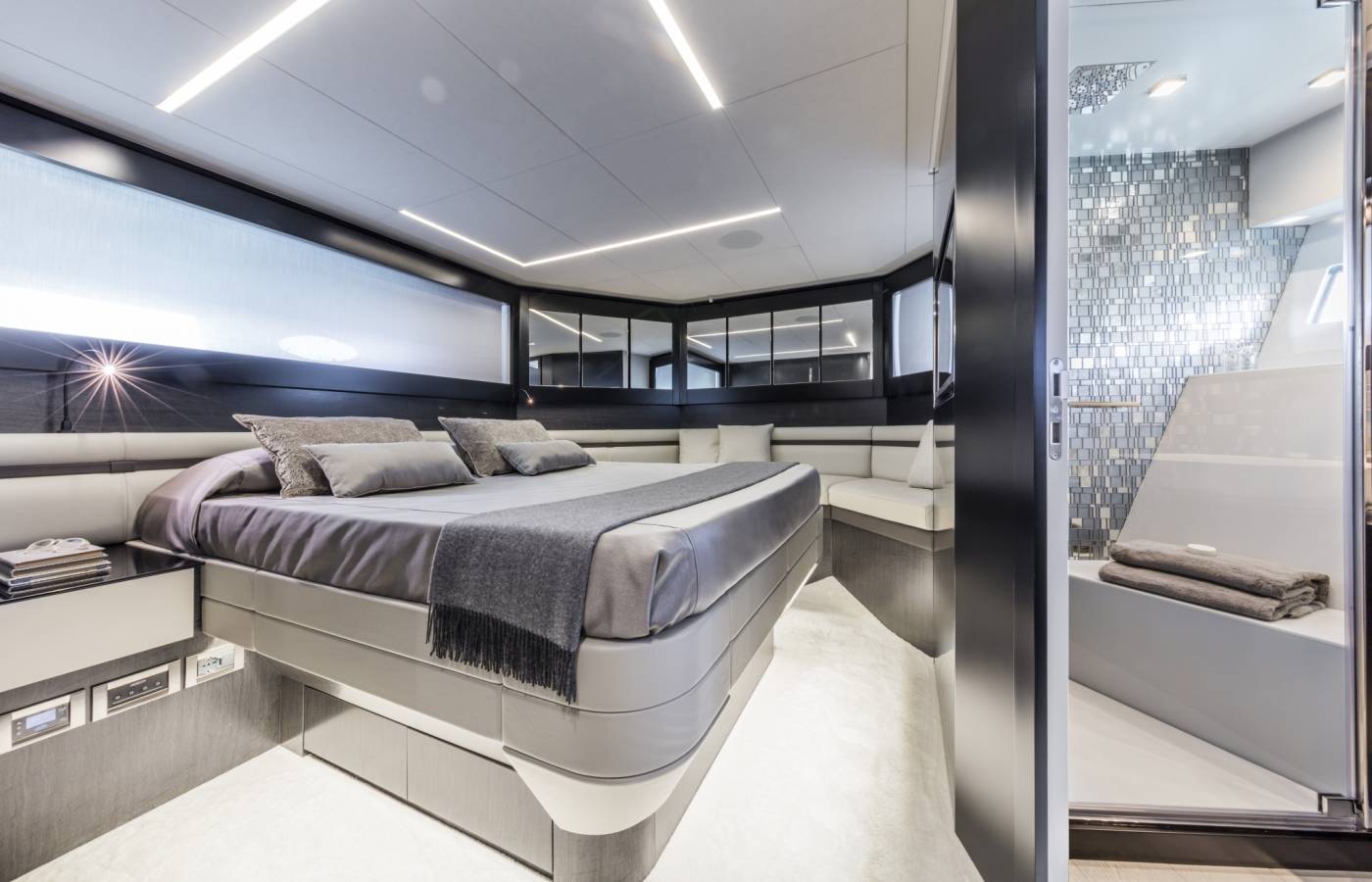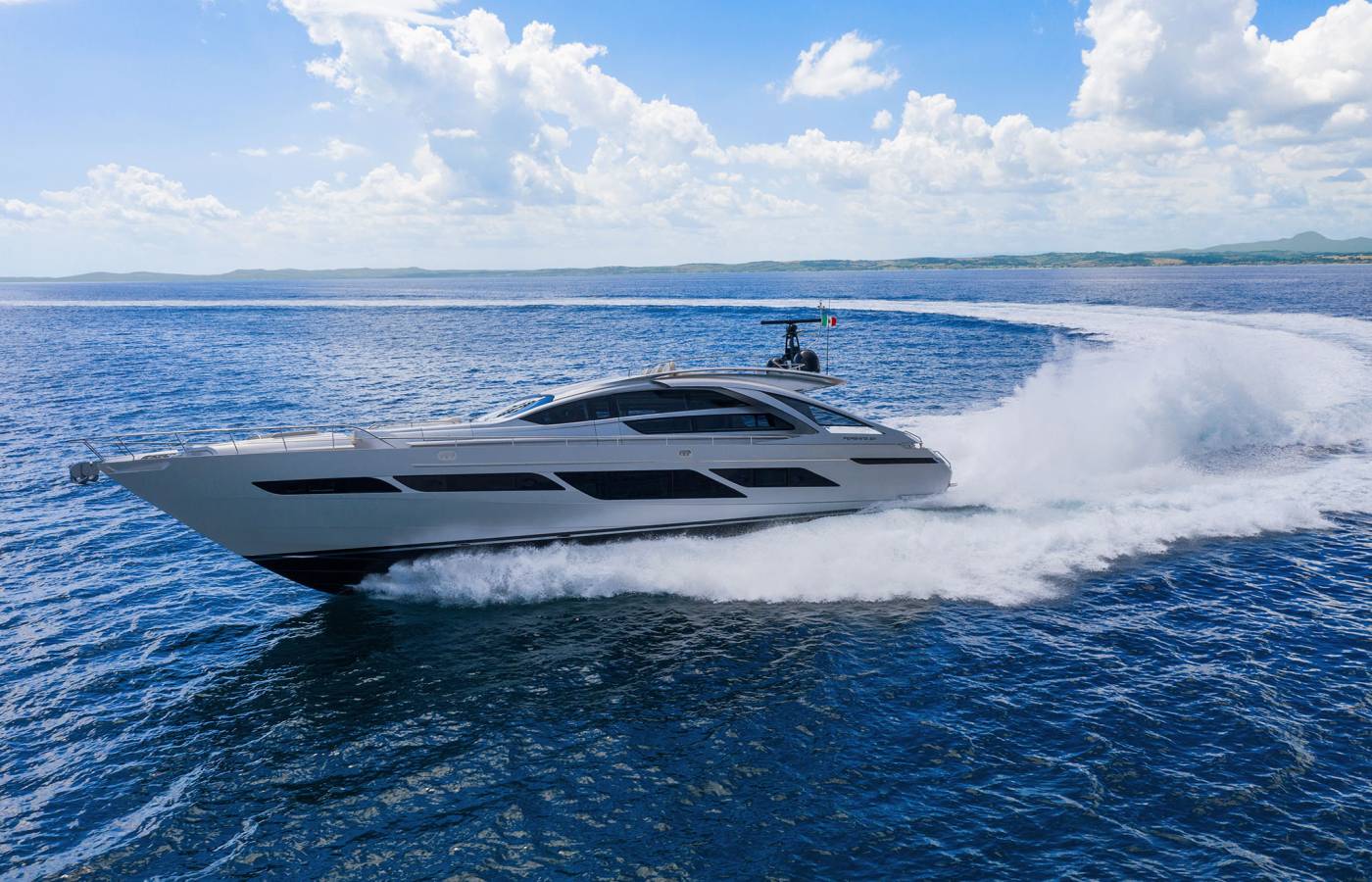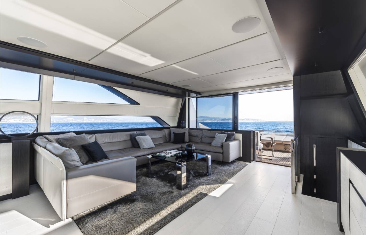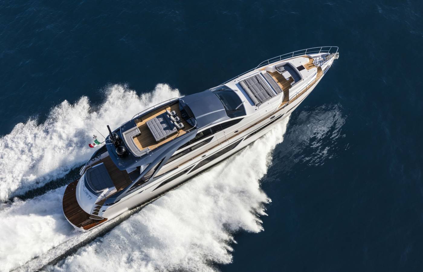 The interior décor boasts the best Italian brands, such as the leather-upholstered “Interior in Motion” helm station which celebrates the partnership between Pershing and Poltrona Frau.