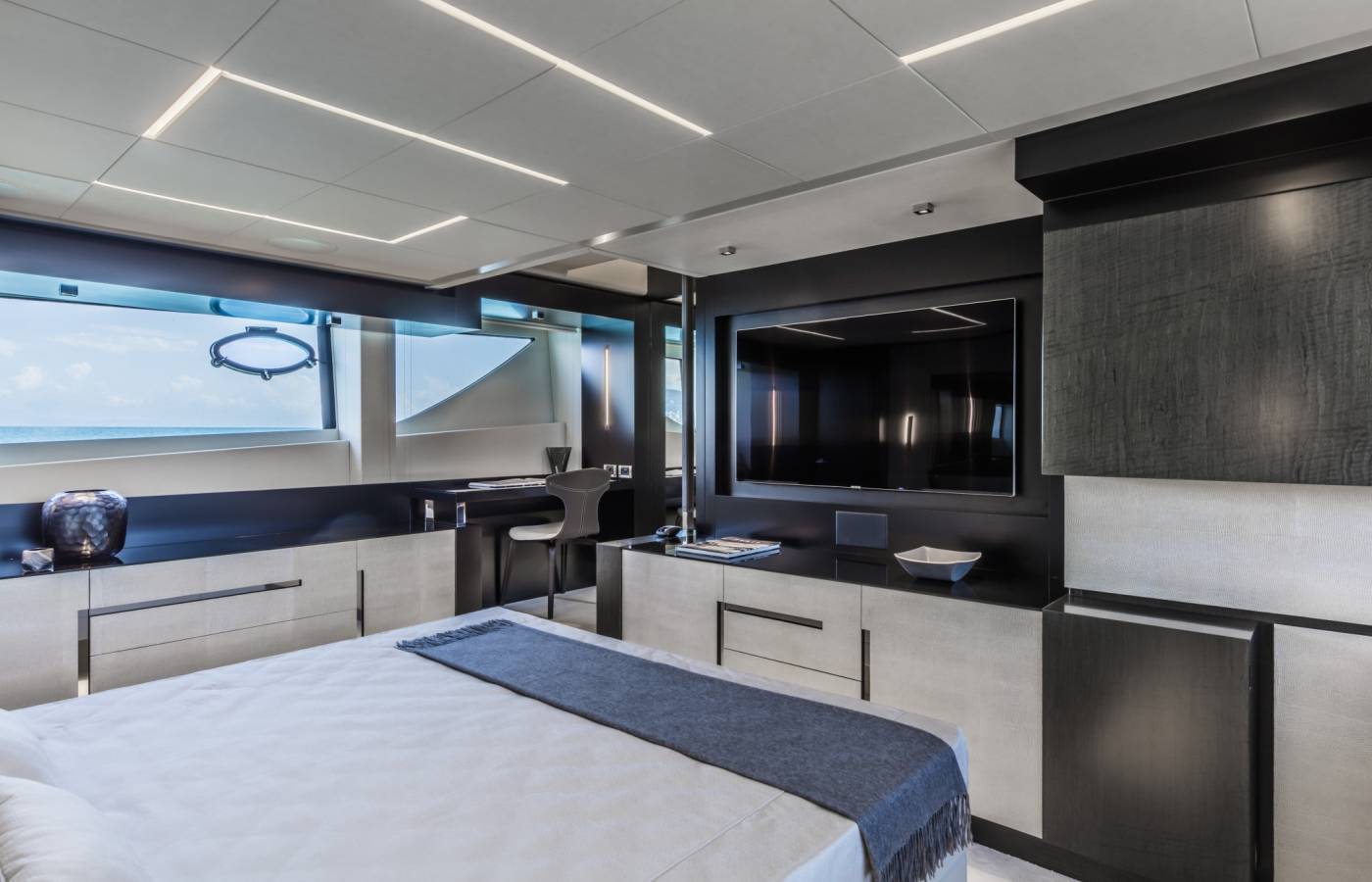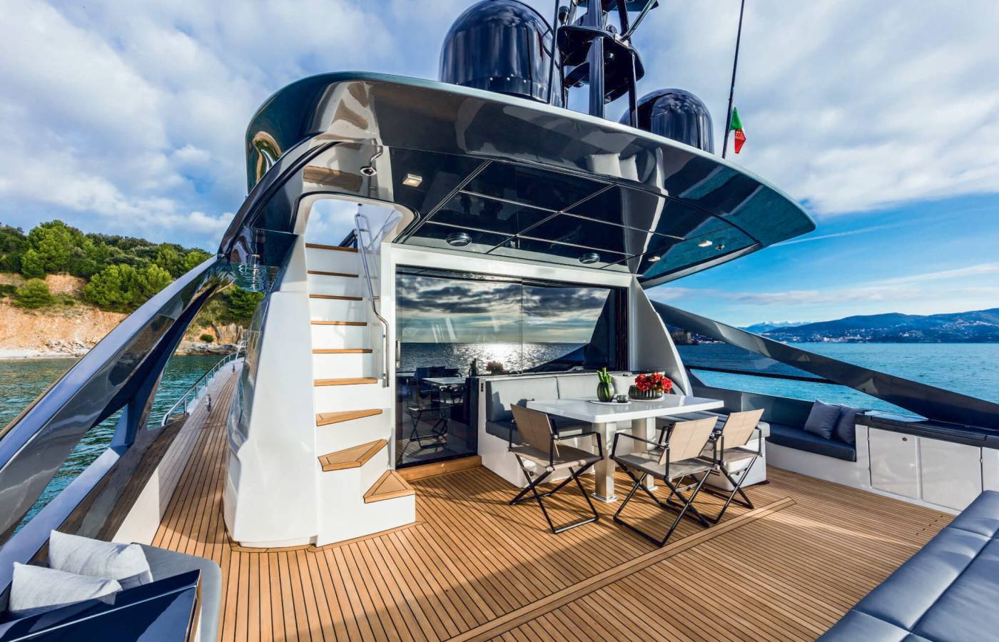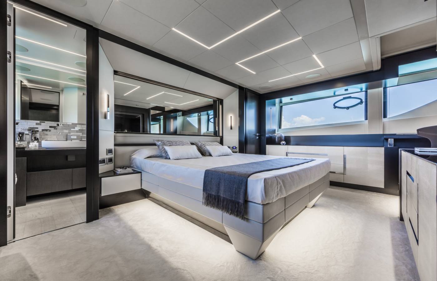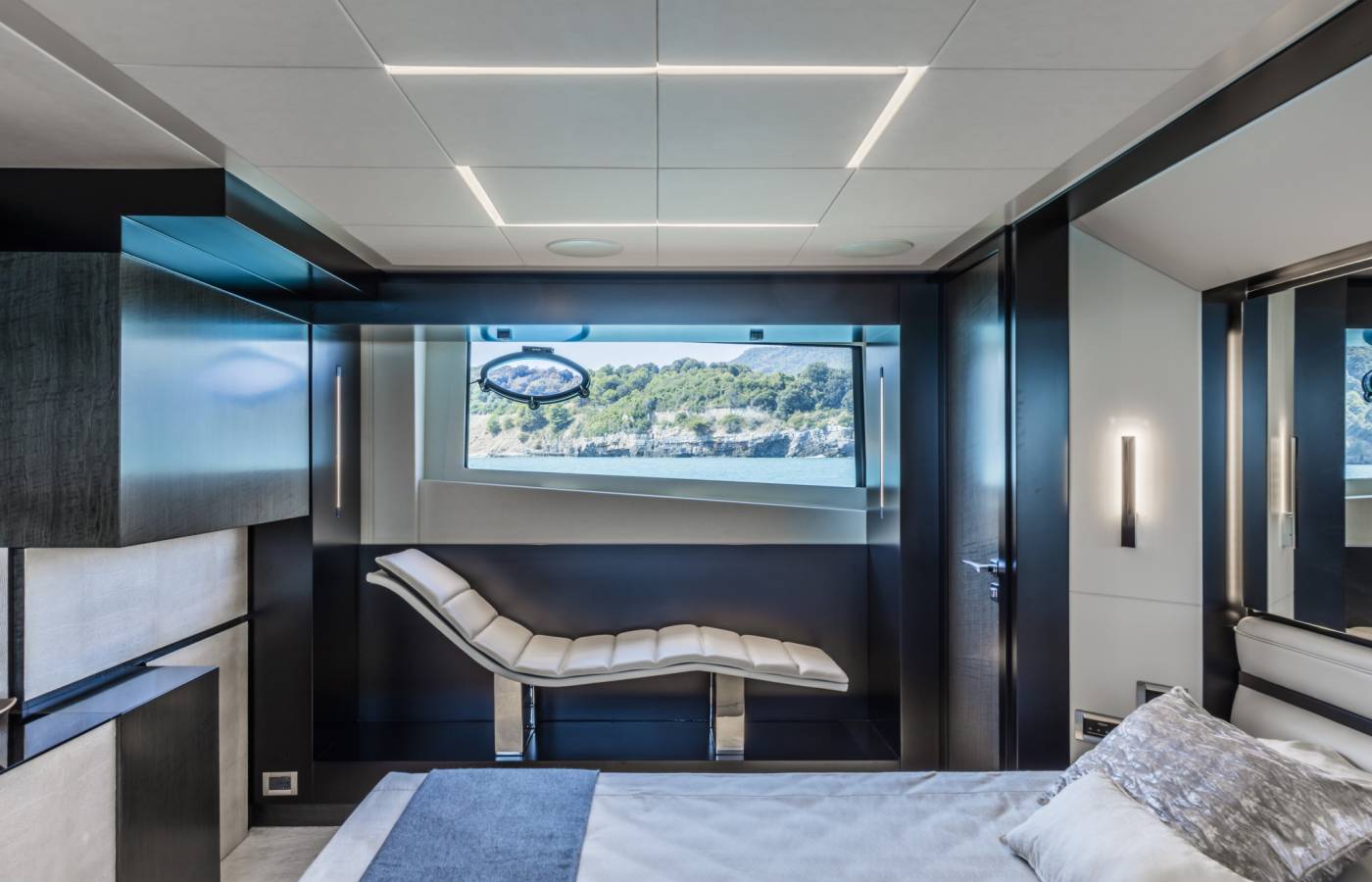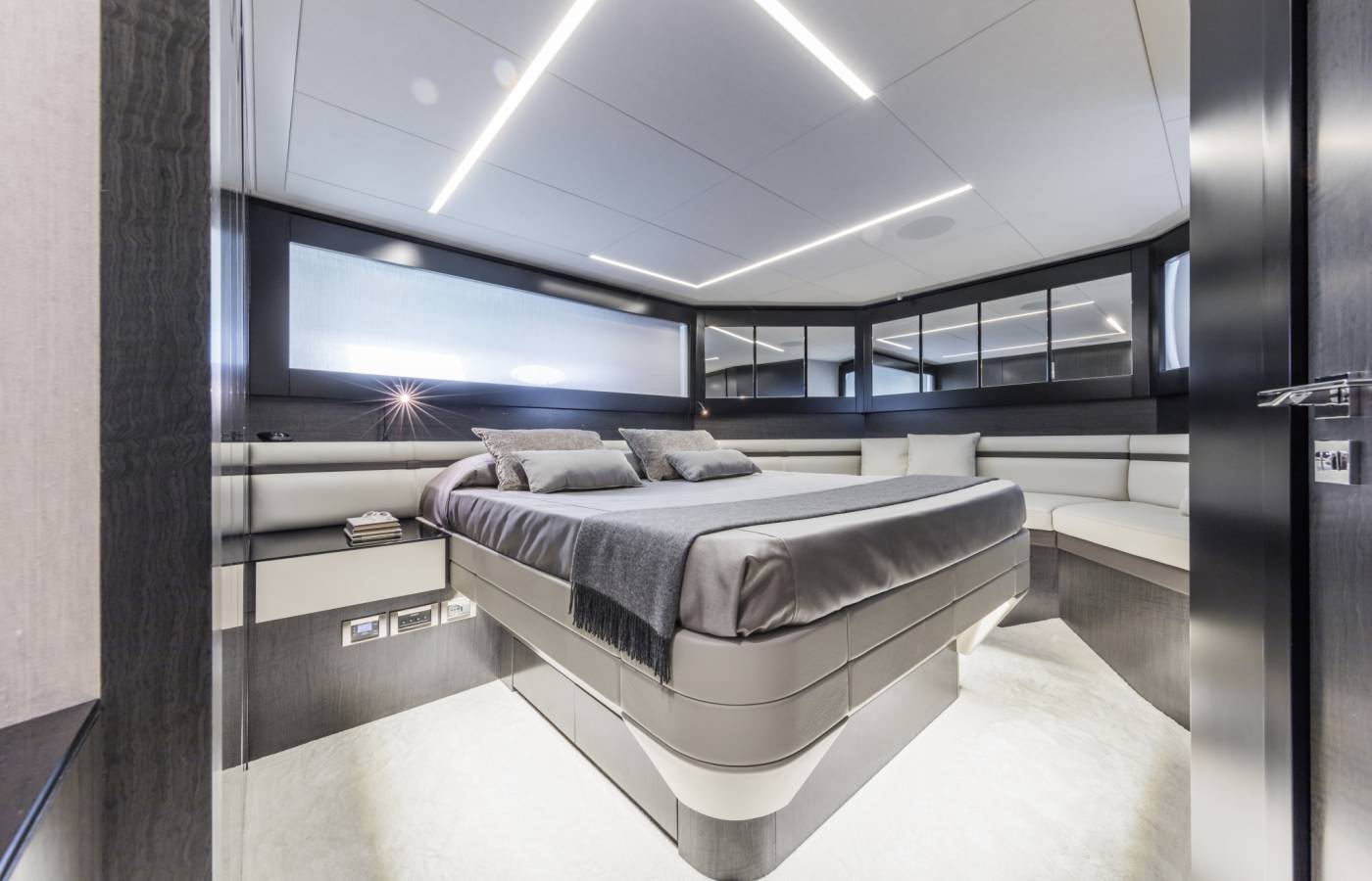The interior décor boasts the best Italian brands, such as the leather-upholstered “Interior in Motion” helm station which celebrates the partnership between Pershing and Poltrona Frau.