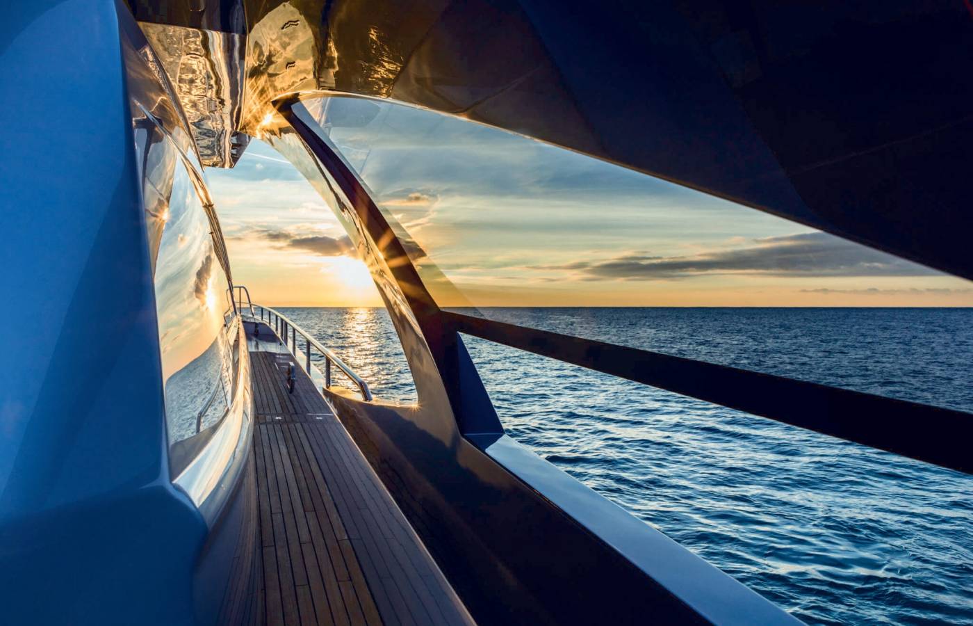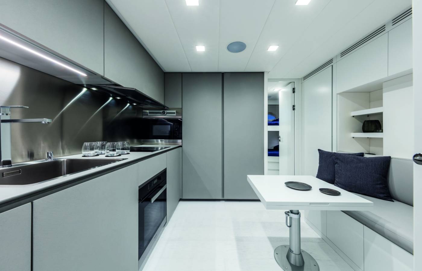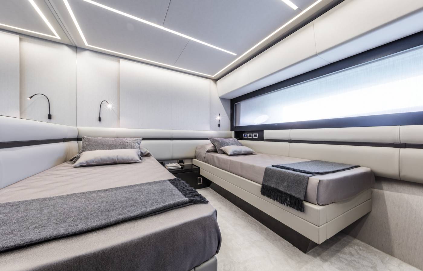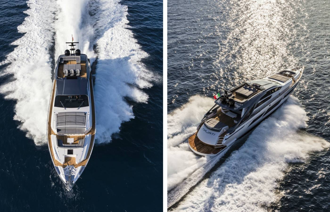 The interior décor boasts the best Italian brands, such as the leather-upholstered “Interior in Motion” helm station which celebrates the partnership between Pershing and Poltrona Frau.
