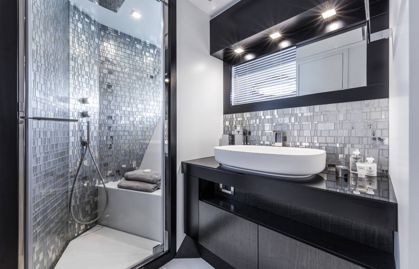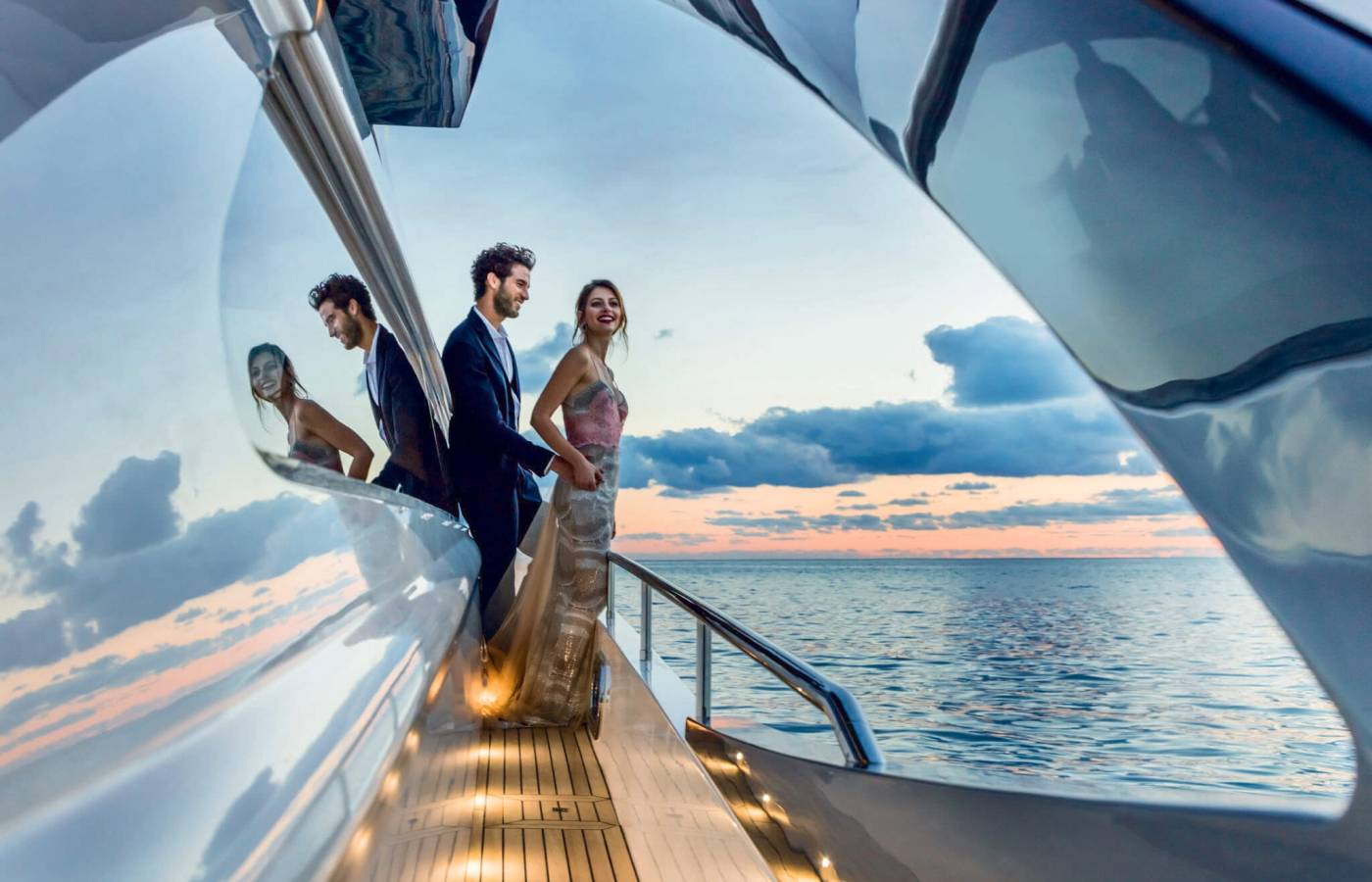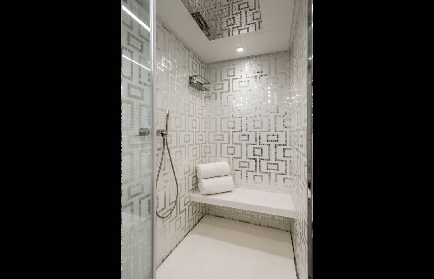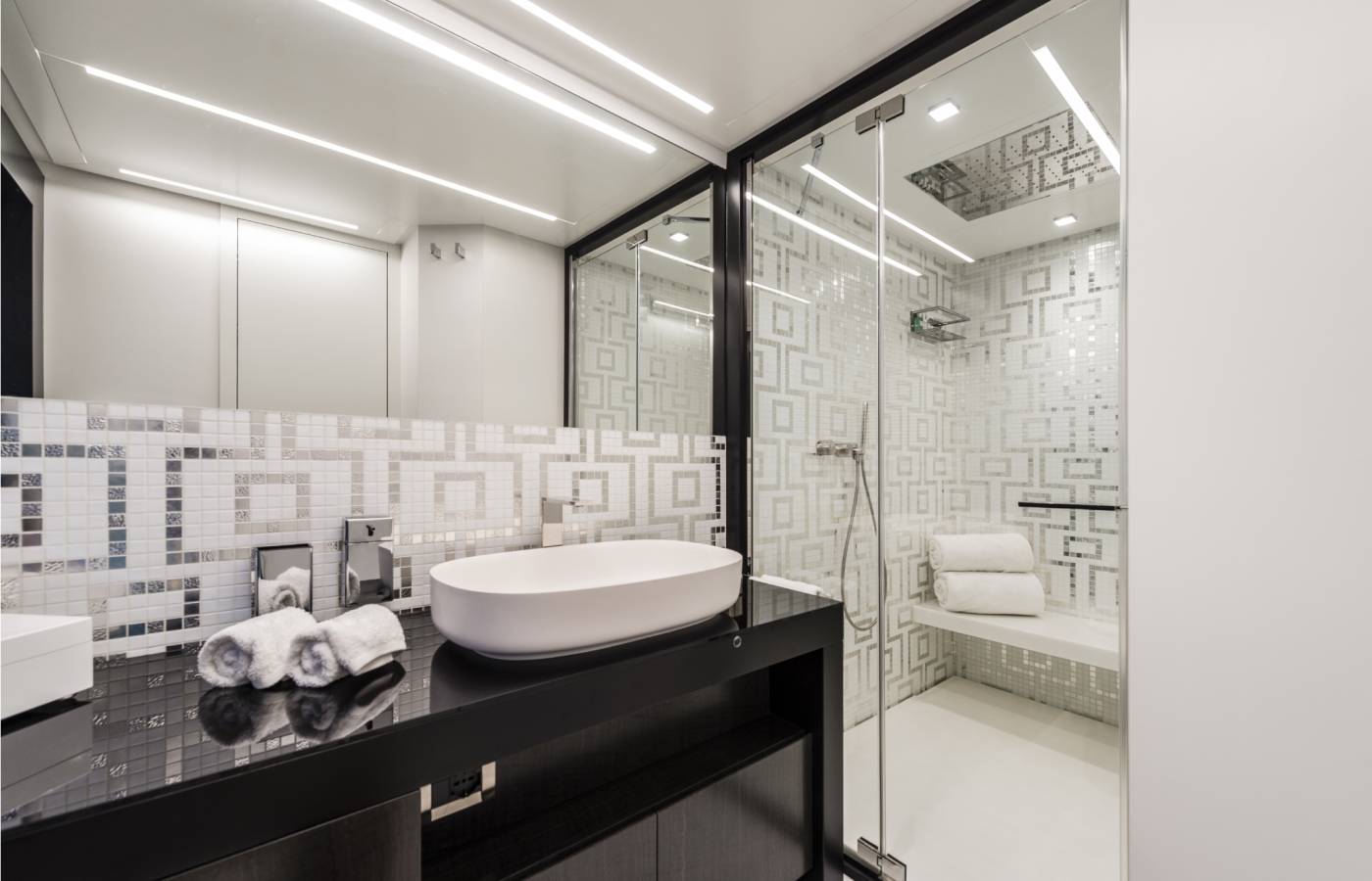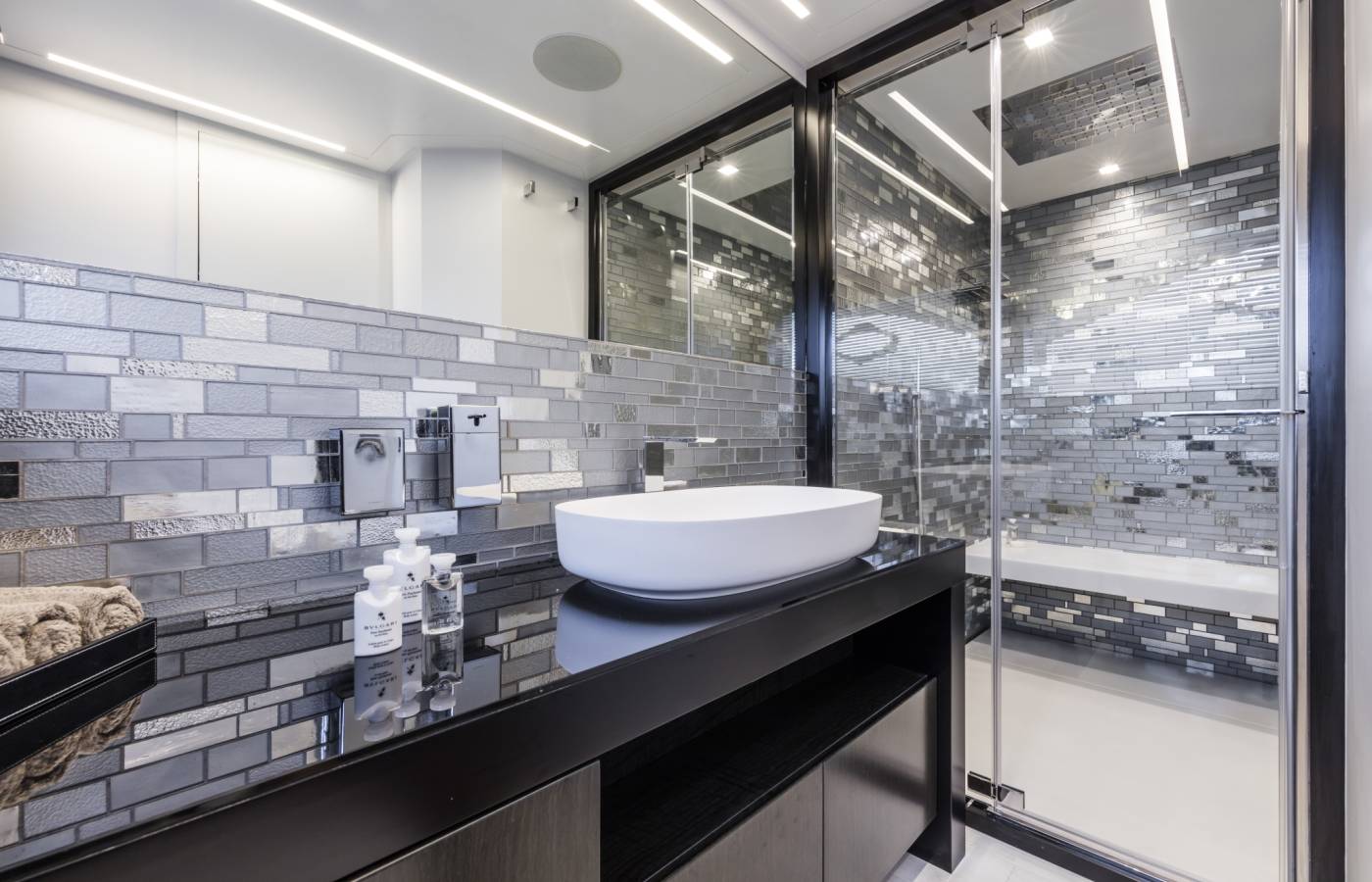 The interior décor boasts the best Italian brands, such as the leather-upholstered “Interior in Motion” helm station which celebrates the partnership between Pershing and Poltrona Frau.