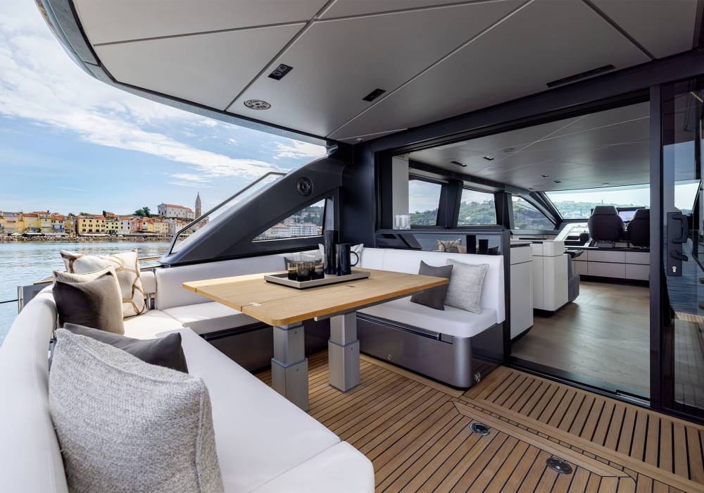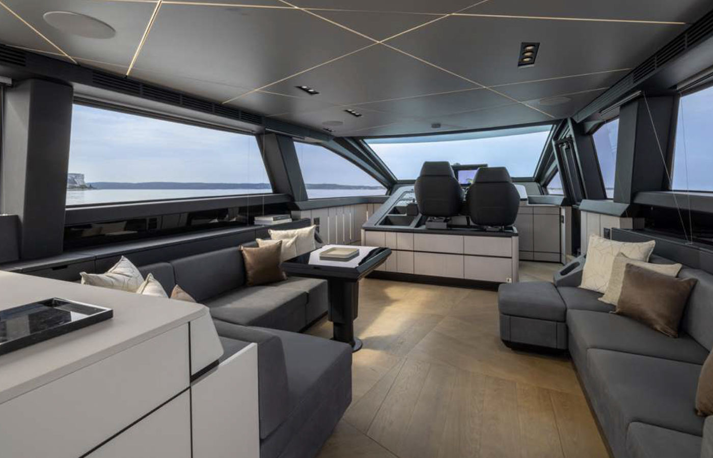 A retractable door and a sophisticated electric window system seamlessly connect the cockpit and the main salon, an integration of design and technology that amplifies the onboard space and enhances its versatility.